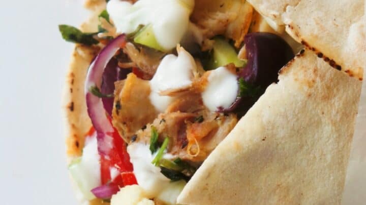 "This homemade Greek chicken wrap is healthy, easy and perfect for dinner! Filled with rotisserie chicken, tzatziki, fresh and roasted vegetables it is quick to make, fresh, flavorful and delicious. This tasty chicken recipe is also easy to meal prep with a few simple adjustments."