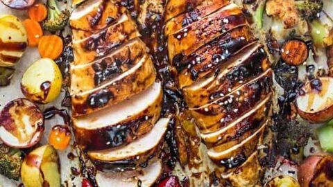 "Sheet Pan Hoisin Chicken – an easy one pan meal with healthy roasted veggies. Best of all, clean up is a breeze making this dinner recipe perfect for busy weeknights."