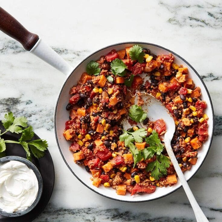 "Spice-laced quinoa, beans and sweet potato give this one-pan vegetarian meal its substantial and hearty feel. While the dish is simmering, put together a crisp side salad or simply chop up some avocado for an easy and complete 30-minute meal."