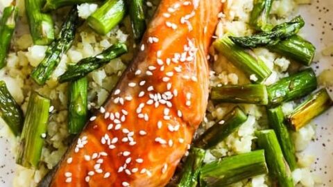 Baked Honey-Teriyaki Salmon and Asparagus with Cauliflower Rice, this 15-minute dinner is not just tasty, it’s also good for you!