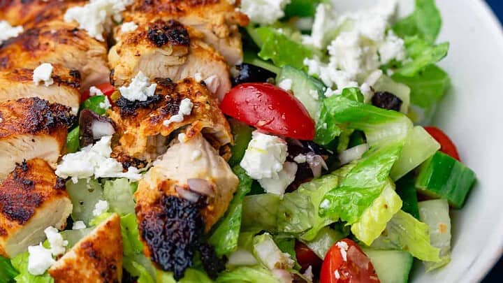 This grilled chicken salad combines marinated chicken, fresh veggies, and bold Greek flavors all in one tasty and easy dinner.
