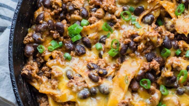 This super easy Skillet Enchiladas recipe will become a family favorite! Ground beef, black beans, a flavorful enchilada sauce, tortillas and cheese come together for a one-pan, 20-minute meal!