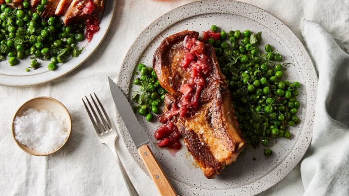 Honey-Butter Pork Chops With Rhubarb Sauce & Herby Peas