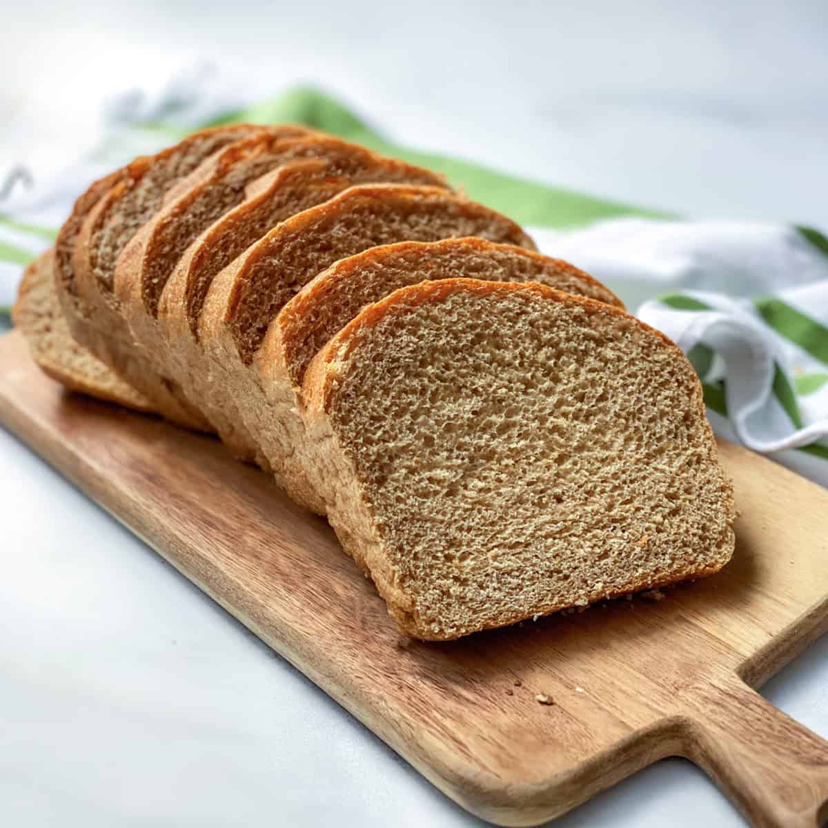 • Sliced whole wheat bread made in two loaves with a striped linen in the background.