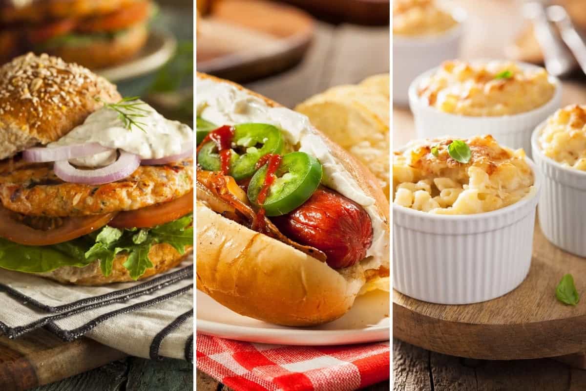 • Three-panel image showcasing classic Seattle Super Bowl Party fare: a chicken burger with fresh vegetables, a hot dog piled high with jalapenos and onions, and individual baked macaroni and cheese served in white ramekins.