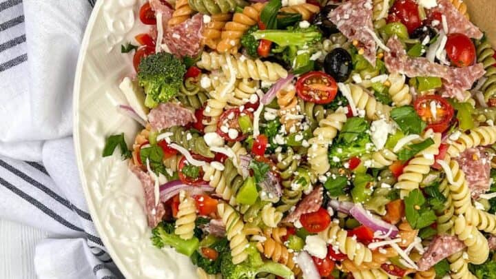 This Mediterranean-inspired Pasta Salad is a favorite with salami, peppers, broccoli, zesty Italian dressing, and Feta cheese.