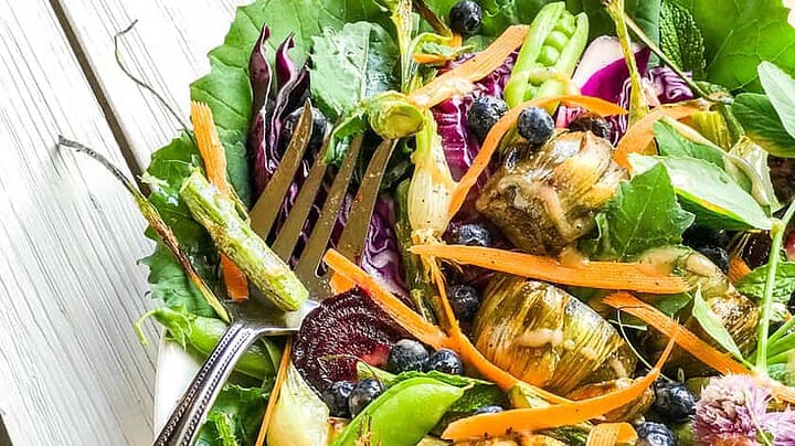 This roasted Antipasto Salad with baby artichokes and asparagus is a delicious summer platter filled with the season’s best vegetables.