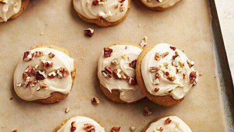 “These chewy cookies give you all the flavor of gooey caramel apples but without the mess. Freeze them, let them thaw, then top them with sweet caramel icing and toasted nuts.”