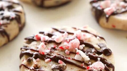 “These Peppermint Chocolate Chip Shortbread Cookies have a buttery cookie base with mini chocolate chips and candy canes. The shortbread melts in your mouth.”