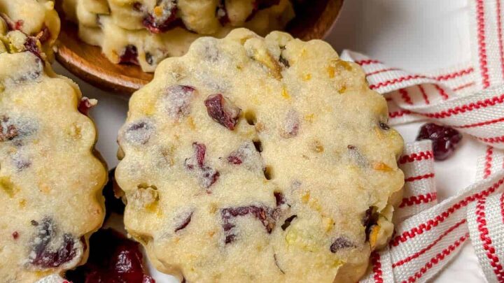 These Cranberry Pistachio Shortbread Cookies are crisp and buttery with holiday fruits, nuts, and flavors like dried cranberries, pistachios, and orange zest. They’re an easy slice-and-bake or cut-out cookie recipe perfect for the holidays.