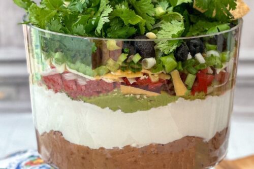 Having a game day gathering or even a summer party is impossible without this iconic 7-layer dip! Whether served in a trifle dish or a glass bowl, it's impressive, incredibly easy, and delicious!