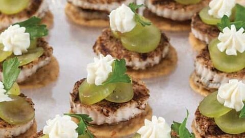 "A tasty combination of green grapes, Labneh, chicken, black-eyed peas, and fresh herbs sit atop a rice cracker in Garam Masala Grilled Chicken & Black-Eyed Pea Canapés."