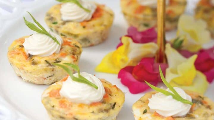 “Fresh tarragon, new potatoes, shallots, baby green peas, and Gruyère cheese gives these Salmon Frittatas plenty of flavor.”