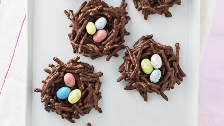 Candy coated chocolate eggs take these nests over the top with cuteness!