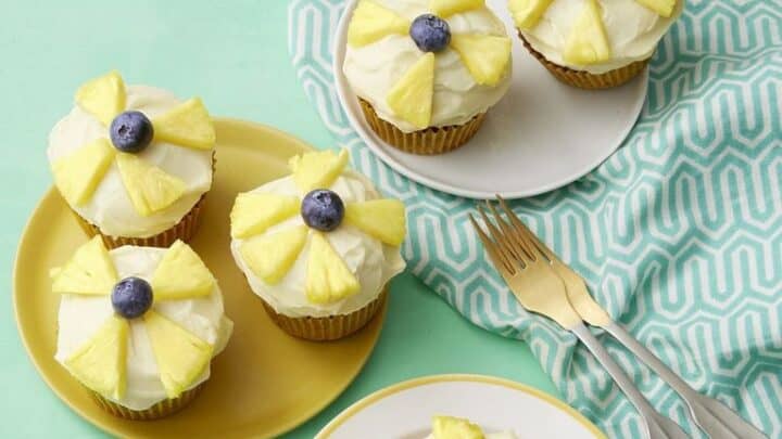 "Fruity cupcakes are the perfect big-batch Easter dessert. Dress them up with blueberry and pineapple flowers for a bit of springtime flair."