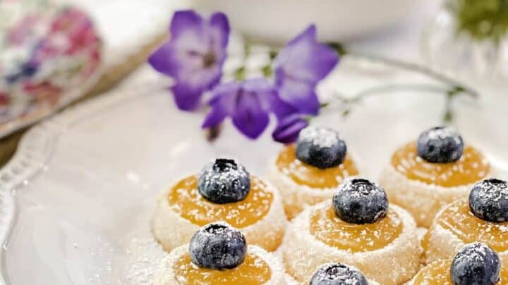 Shortbread Tea Cookies with Lemon Curd, topped with fresh blueberries, are tiny bites of perfection. Petit and perfectly sized for afternoon tea, they are melt-in-your-mouth delicious.