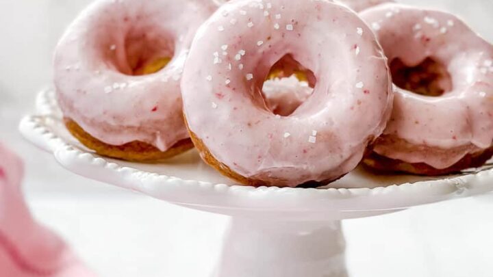 This incredibly delicious, super easy Baked Strawberry Donut recipe is packed with fresh strawberries, dipped in strawberry glaze, and so tender and moist they almost melt in your mouth.