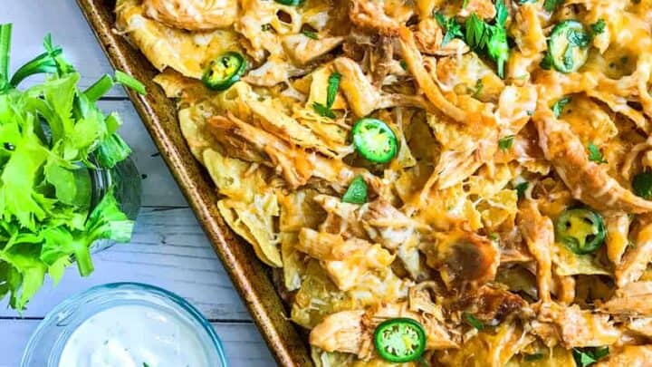 So Easy Sheet Pan Buffalo Chicken Nachos