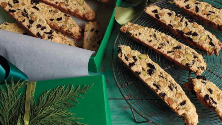 "Shredded coconut, lemon zest, dried cherries, and pistachios make a lovely quartet of flavors in these classic Italian cookies. Cornmeal gives them a pleasantly crumbly texture.”