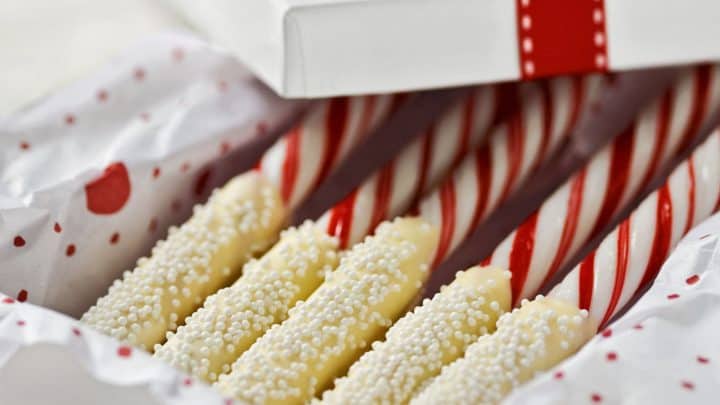 “These peppermint sticks look beautiful and taste even better! Leave out a dish of them when trimming the tree or relaxing by the fire with a mug of hot cocoa.”