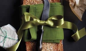 To Package: "Find a small cheese board (we love the modern look of slate) and roll dough just a tad smaller than the board. Once crackers are baked and cooled, wrap them on the board with a tea towel, top with a spreader, and finish with a bow.”