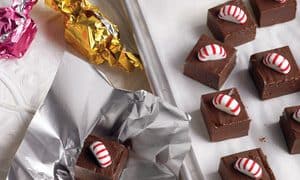 "We love the peppermint candies peeking out of these bite-size squares of rich fudge. Use parchment or colored plastic wrap to package, or visit a crafts store for shiny, colorful foil squares. Twist the ends for a candy-like look, then stuff some stockings!"