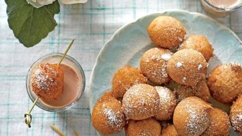 “Wash these warm, sugary doughnut bites down with a shooter of ice-cold chocolate milk. I like to stick the milk in the freezer about 10 minutes before serving.”