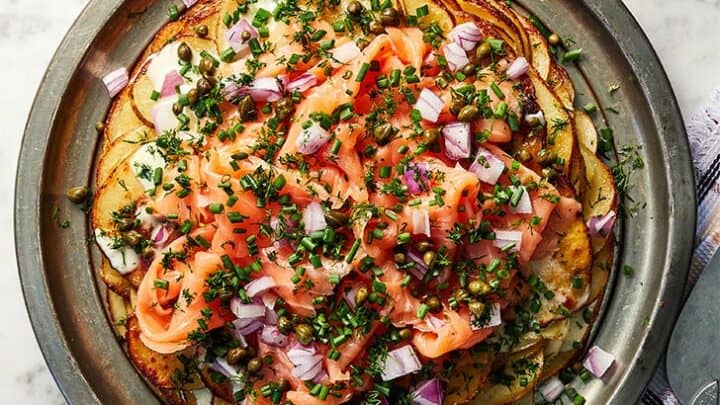 "Everything you love about a Nova lox bagel with all the trimmings, plus crispy, paper-thin layers of Parmesan potatoes."