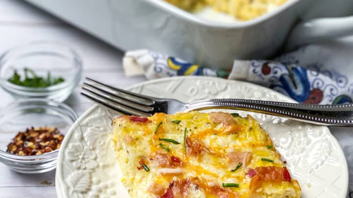 This Hashbrown Breakfast Casserole is an easy and delicious casserole, perfect for Mother's Day brunch. This savory breakfast casserole is packed with flavor and everything you love for breakfast. It's made with hashbrowns, eggs, bacon, and cheese. Perfect for a make-ahead breakfast.