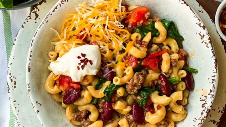 This Instant Pot Chili Mac and Cheese is an easy pasta dish and family favorite dinner. A blend of lean ground beef, macaroni, chili beans, tomatoes, and spices. And, of course, melting cheddar cheese. An easy dinner to table meal in around 15 minutes, give or take a few.