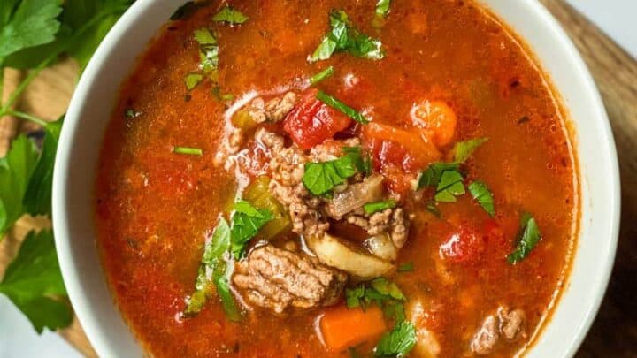 Hamburger Soup is a classic, easy, and hearty comfort food soup loaded with vegetables, lean beef, tomatoes, and chunks of soft potatoes. It's the perfect quick and easy soup for busy days. And is ready in 30 minutes or less.