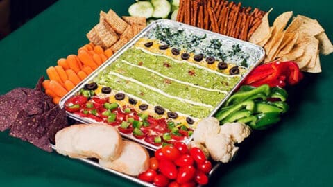 “Sometimes it’s all about the presentation. In just three steps, you can assemble a football-themed Snack Stadium to showcase all your game day dips! We love using our Cheesy Guacamole Dip for the field!”