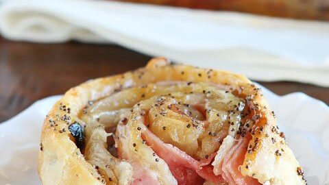 These Hot Ham & Cheese Party Rolls are so good! Honey Maple Glazed Ham and melty Swiss cheese are rolled up (cinnamon bun style!) in soft, fluffy pizza dough. Then they’re drizzled with a brown sugar poppy seed glaze and baked until golden, gooey, and crispy.