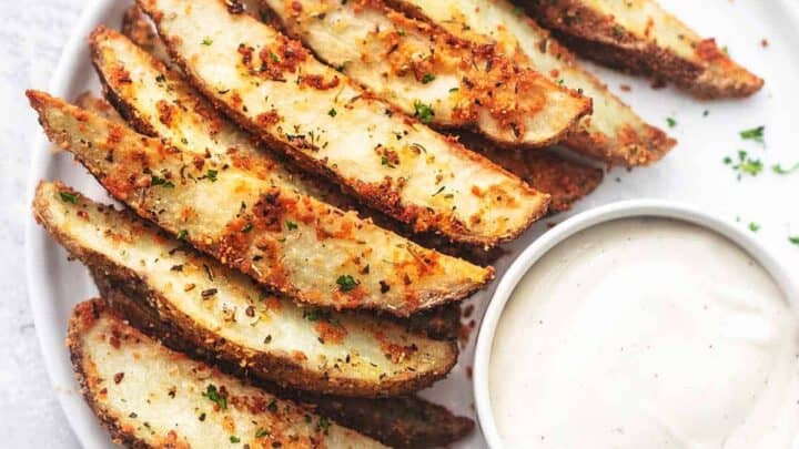 Baked garlic parmesan potato wedges oven roasted to golden tender perfection!