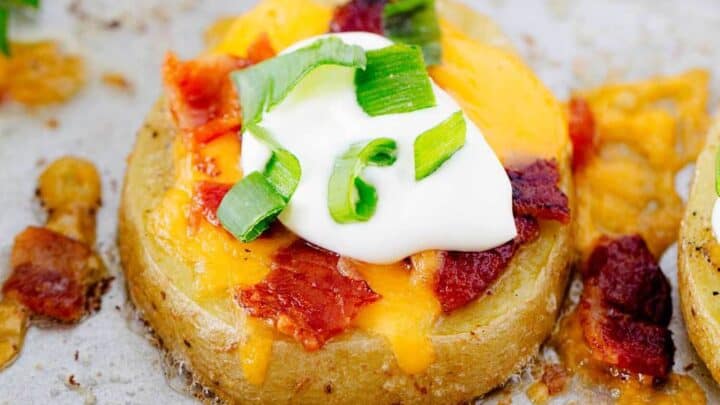 These potato rounds are topped with cheddar cheese, crumbled bacon bits and taste great topped with a little sour cream!
