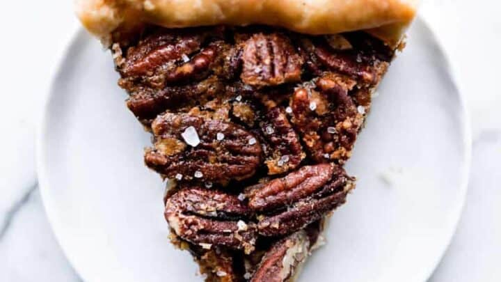 "Maple syrup can replace corn syrup in this deliciously simple maple pecan pie recipe! Top with a little sea salt to balance out the flavors."