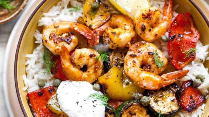 "Greek shrimp bowls with zucchini, peppers, and grains topped with Lemon-Garlic Yogurt. A 30-minute meal perfect for meal prep or healthy weeknight dinners."