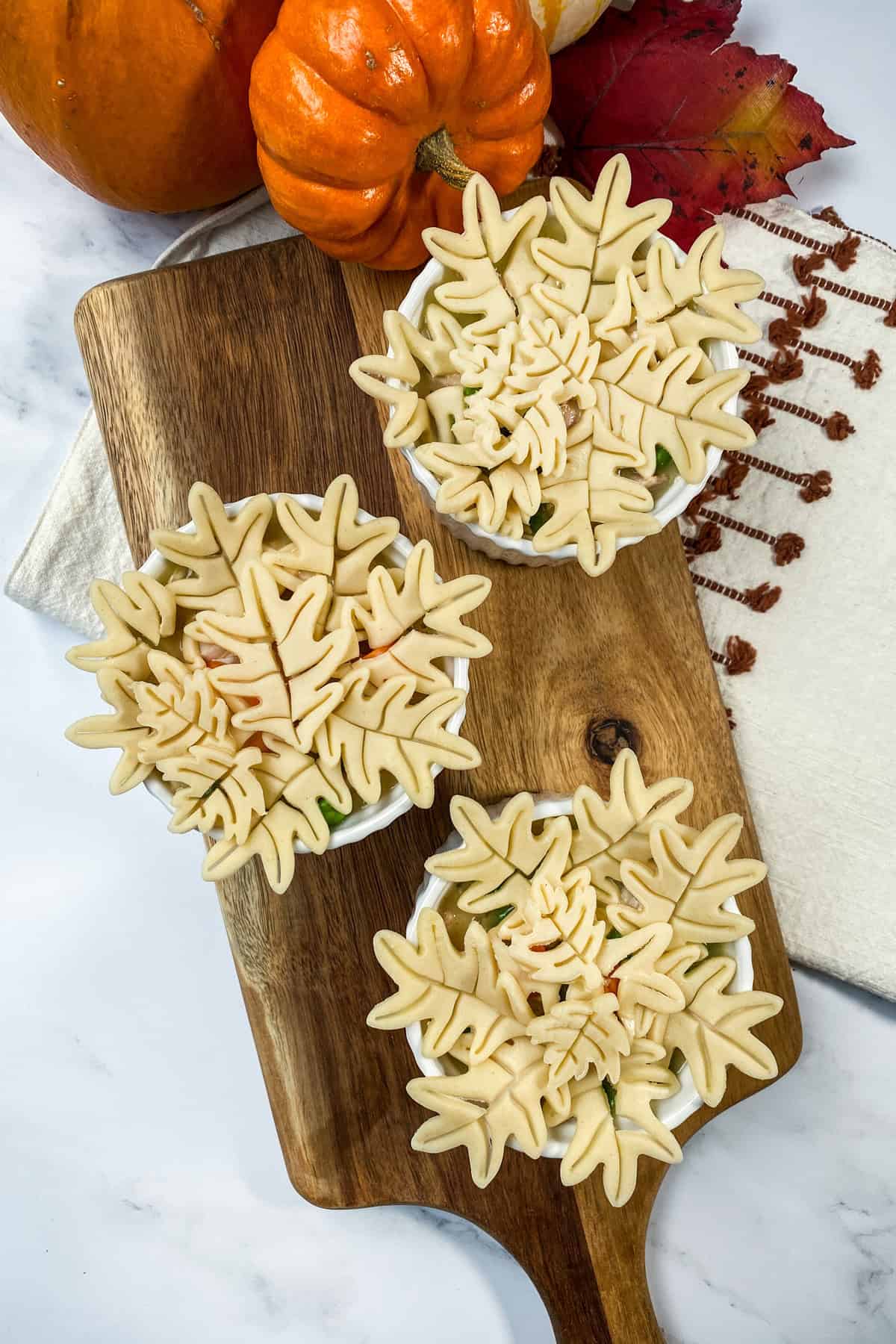 - Cut leaf shapes from refrigerated or frozen and thawed store-bought pie crust or puff pastry. Set aside and place 4-6 ramekins on a baking sheet.