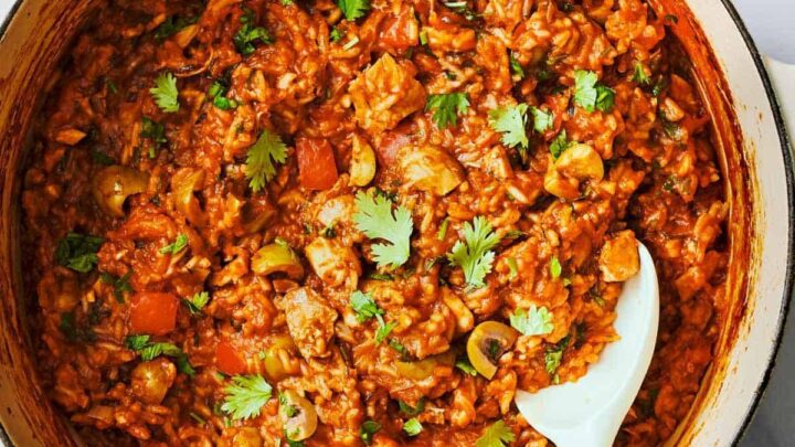 "Rich and savory Arroz Con Pollo with delicious tomato flavor, juicy chicken, tender rice, lots of herbs and spices, plenty of lime juice, and a handful of jalapeño-stuffed green olives. Bright and spicy and comforting!"