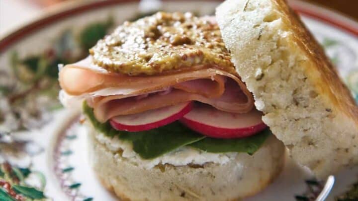 "Rosemary Crumpet Sandwiches offer an herb-seasoned twist on the traditional English biscuit, which is cooked on a griddle then sliced and lightly toasted."