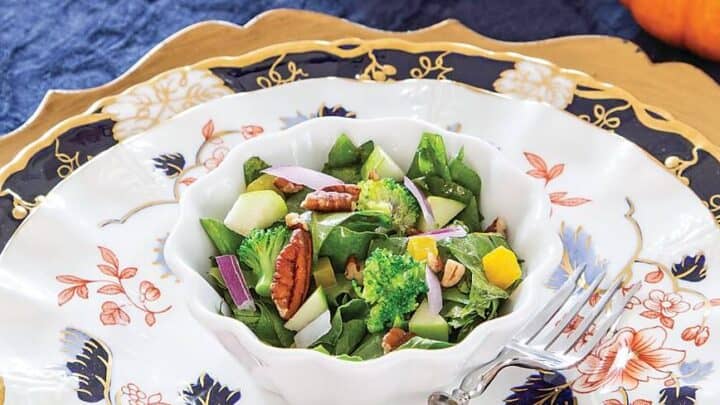 "A hearty cooked salad of beets, broccoli, and onion, tossed with fresh apple, toasted pecans, and apple cider vinaigrette is a refreshing complement to the sandwiches typically served for afternoon tea."