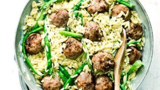 "This springtime pasta dish requires just four ingredients. The perfect, fuss-free feast with a creamy sauce and pork meatballs that's bound to be a hit."
