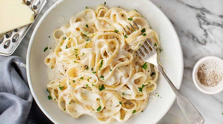 This lightened up version of a restaurant favorite substitutes some ingredients for healthier choices, but keeps the creamy deliciousness we all love. Add a big, green salad, and for me, I always have to have a side of broccoli too. Add chicken if you want to add additional protein.