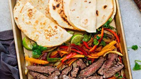 "Sheet Pan Steak Fajitas are tender, juicy and full of flavor and perfect for busy weeknights! Cooks up in under 30 minutes on one pan with options for paleo/ Whole30, low carb and keto with a homemade fajita spice blend."