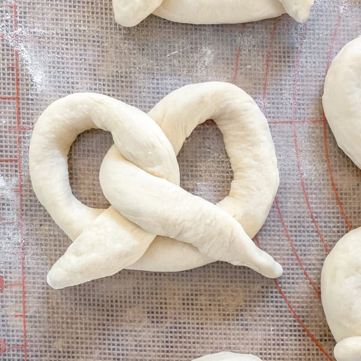 - Shape the Pretzels: Roll each portion into a 20-22-inch rope. Form a circle by bringing the 2 rope ends to the top of the circle and twisting the ends together. Then, bring the twisted ends to the bottom of the circle and press then gently into the dough to form a pretzel shape.
