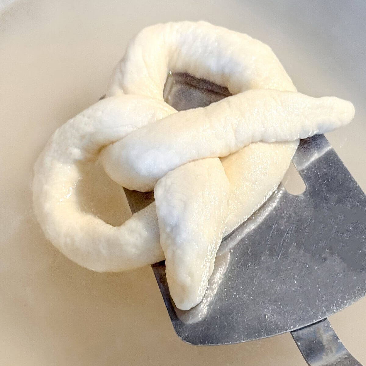 - Step 5: To the water bath, carefully drop 1-2 pretzels into the boiling water for 20-30 seconds, but not longer. Using a slotted spatula, lift the pretzel out of the water, let it drain, and place it on a prepared baking sheet.