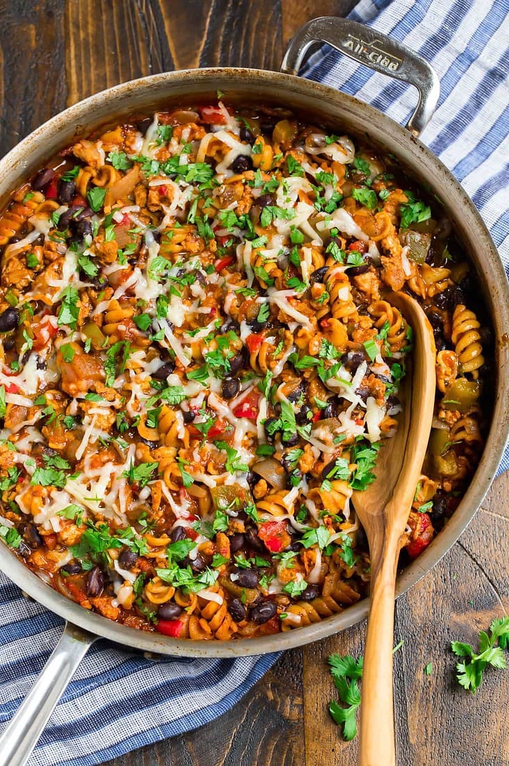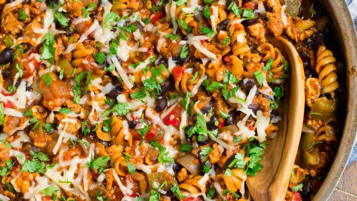 "This cheesy taco pasta is an easy recipe that cooks in one pan! Made with chicken or beef, it's a 30-minute dish perfect for busy nights!"