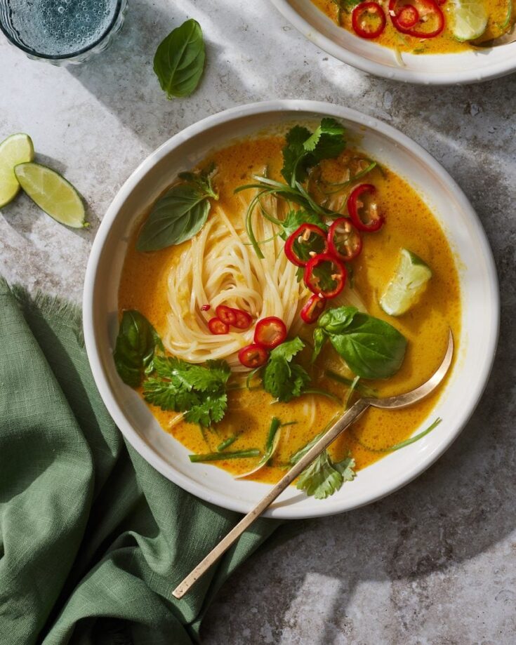"The base of this Curry Coconut Noodle Soup is an incredible broth that doesn’t take too long to whip up, and then you just load it up rice noodles to soak up some of the sauce and thicken it up and top it with all sorts of herbs to give it that bright finish. And if you want to add some extra protein, you could easily add some shredded rotisserie chicken or poached shrimp."