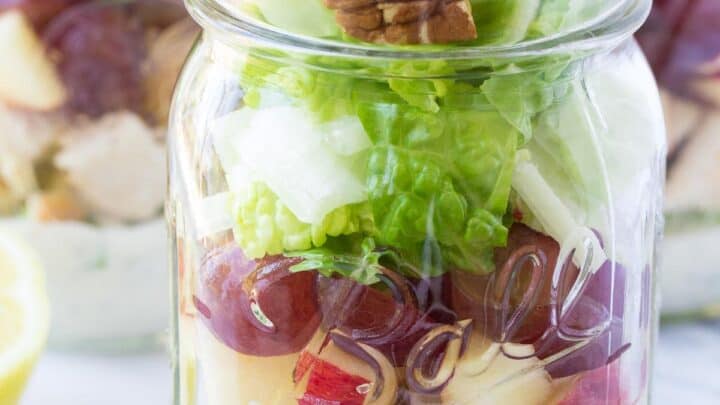 "Make these easy Chicken Salad Mason Jar Salads for make ahead lunches during the week! With grapes, apple, toasted pecans, and a creamy poppy seed dressing, these healthy meal prep salads are sure to become a favorite!"