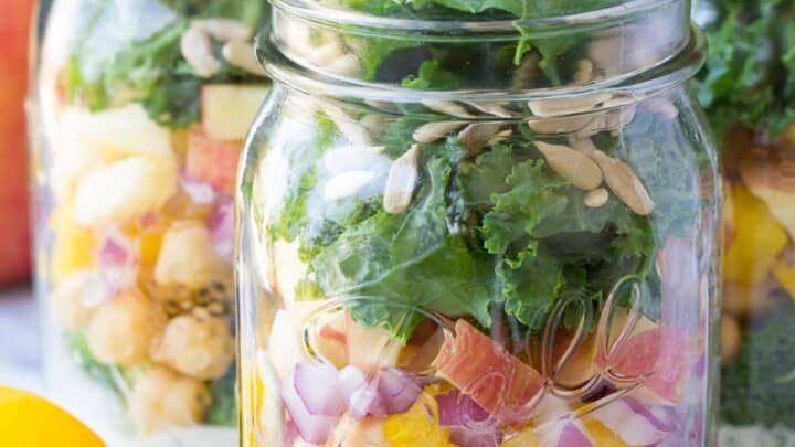 "These easy vegetarian Mason Salads with Broccoli, Kale and Apple are a delicious make ahead lunch option!"